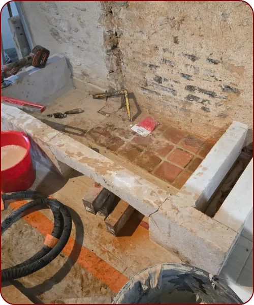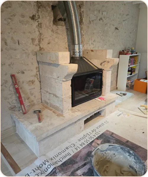 Je m’occupe aussi de la rénovation de cheminée, qu’il s’agisse de reprendre un conduit, renforcer une maçonnerie, réparer un soubassement ou remettre en état la partie extérieure.